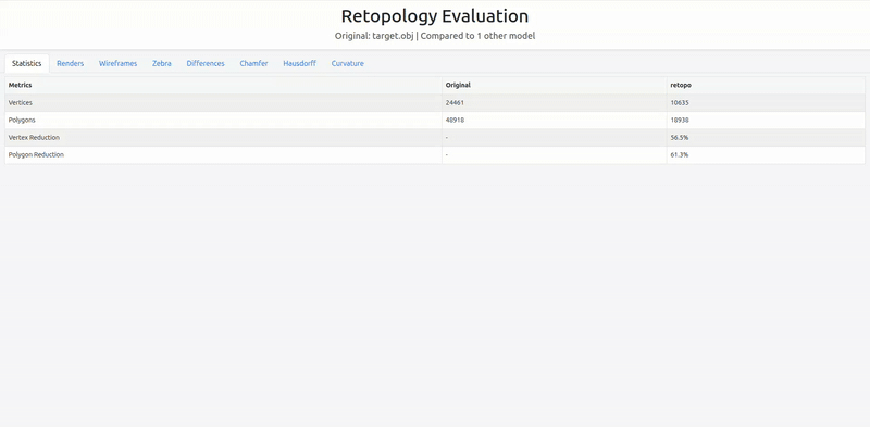 To measure how well the system actually performs, we also built an in-house evaluation suite called RetopoCheck. This tool compares meshes across multiple dimensions: statistics, renders, wireframes, zebra stripes, pixel-wise differences, and geometric metrics like Hausdorff distance and curvature. With this, it becomes easy to spot errors, highlight areas needing improvement, and iteratively refine the system. It’s the same tool we used to tune Retopomeister itself, providing constant feedback loops for quality.