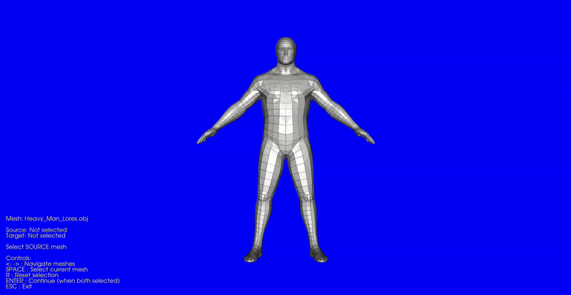 The second mechanism is mesh wrapping, where the source topology is deformed to fit the target geometry as closely as possible following the keypoints. This even allows T-pose topologies to be fitted on A-pose geometries and vice versa. Earlier tools, like Blender’s Softwrap plugin, required manual adjustments, moving the mesh over the target like a digital “skin.” Retopomeister automates this process using a neural network, fitting the source mesh over the target efficiently.